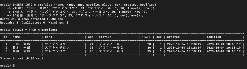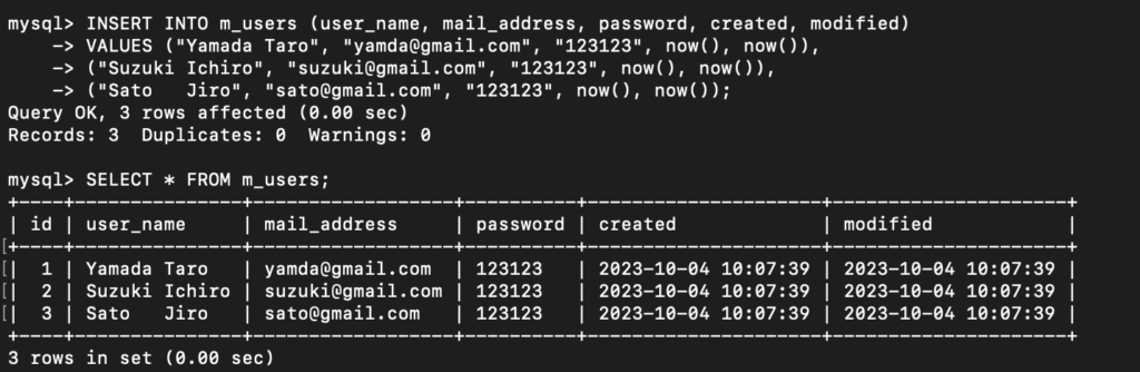//--挿入 mysql> INSERT INTO m_users (user_name, mail_address, password, created, modified) VALUES ("Yamada Taro", "yamda@gmail.com", "123123", now(), now()), ("Suzuki Ichiro", "suzuki@gmail.com", "123123", now(), now()), ("Sato Jiro", "sato@gmail.com", "123123", now(), now()); //--挿入確認 mysql> SELECT * FROM m_users; mysql> INSERT INTO m_profiles (name, kana, age, profile, place, sex, created, modified) VALUES ("山田 太郎", "ヤマダタロウ", 21, "プロフィール1", 20, 1,now(), now()), ("鈴木 一朗", "スズキイチロウ", 33, "プロフィール2", 30, 1,now(), now()), ("佐藤 治郎", "サトウジロウ", 23, "プロフィール3", 35, 1,now(), now()); //--挿入確認 mysql> SELECT * FROM m_profiles; |