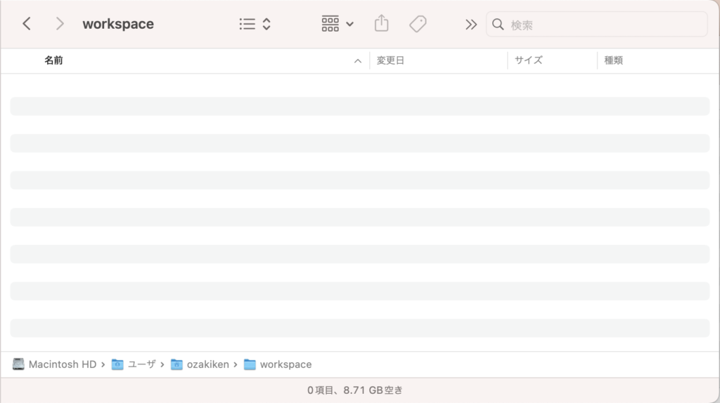 ①「pwd」コマンドで表示した下記のパスをコピー /Users/ozakiken/workspace ②「Finder」を開き、Shift+Command+Gを押して、Command+Vで貼り付け、Enter |