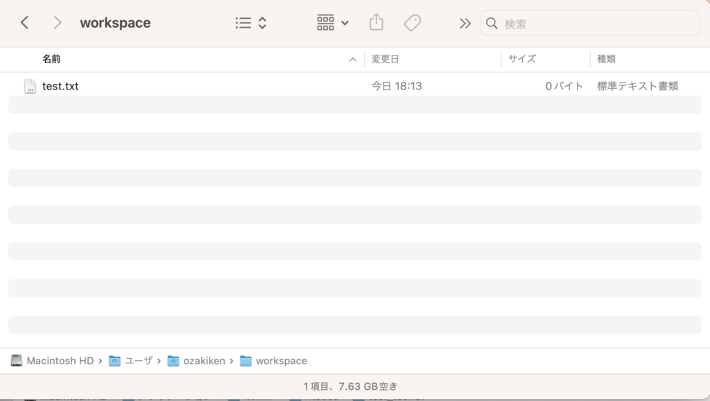 7. 「workspace」フォルダを開き、中身に「test.txt」が作成されているか確認。