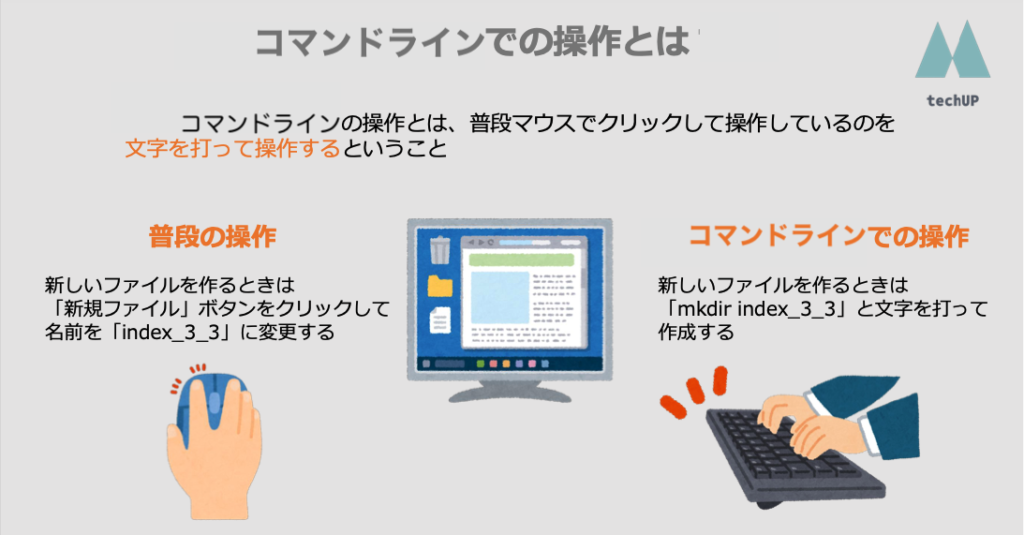 「コマンドライン」とは「コマンドプロンプト」でユーザーがキーボードからコマンドを打ち込んで処理を実行する方法です。