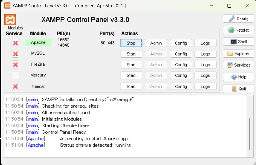 pache,MySQL,FileZilaの「Start」ボタンを押下する。起動した後、http://localhost/をブラウザでURLを入力して確認してください。