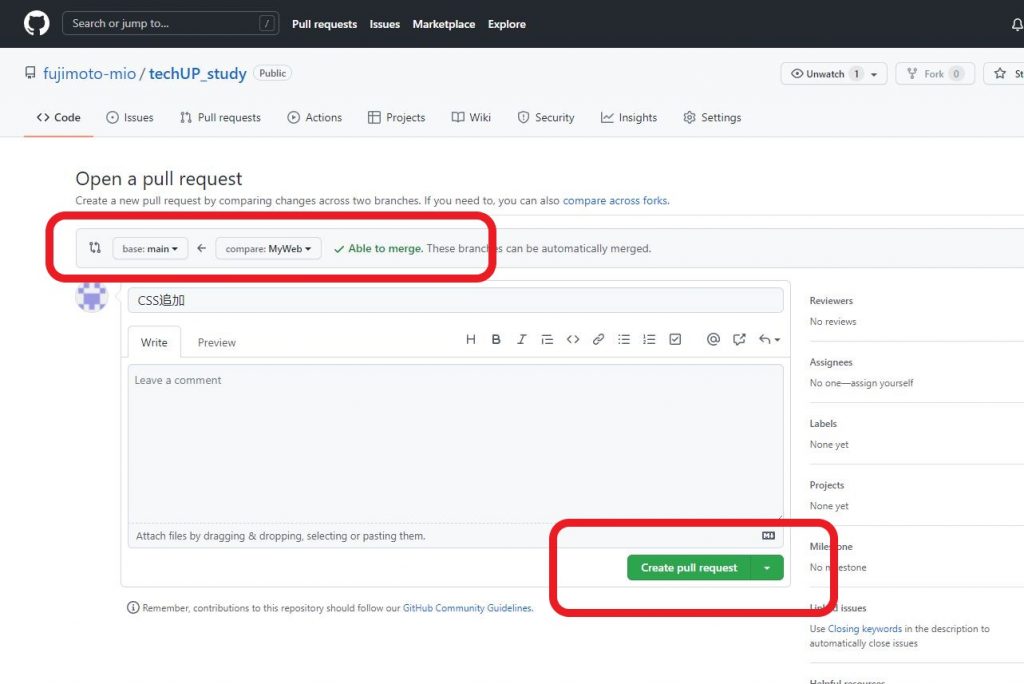 ⑥マージ先を指定して、プルリクエストする内容を記載する