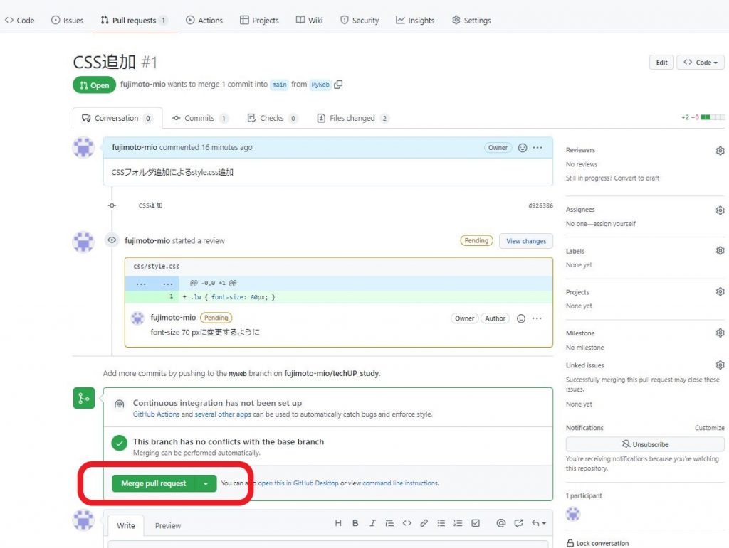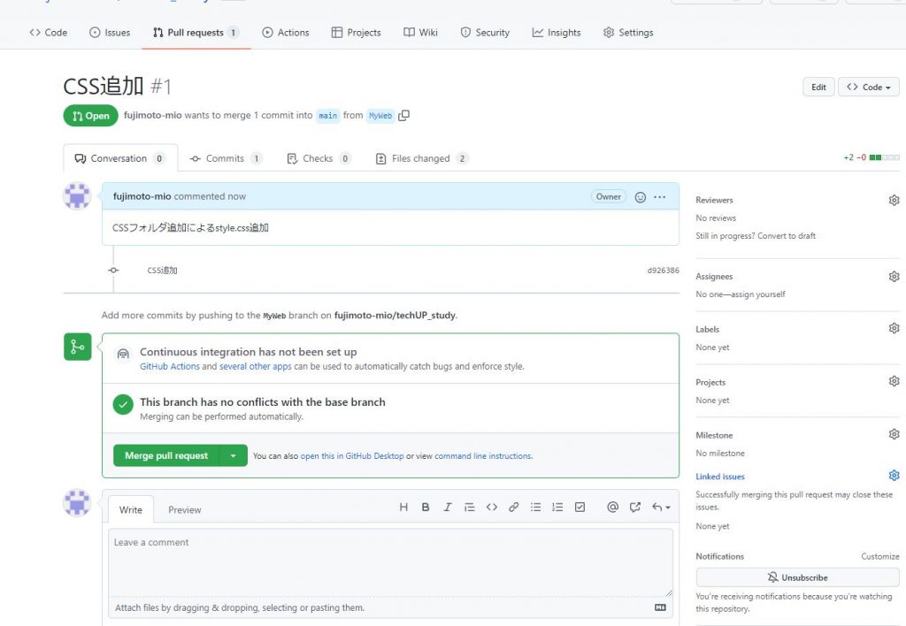 ⑦プルリクエスト作成したら下記のような表示になります。