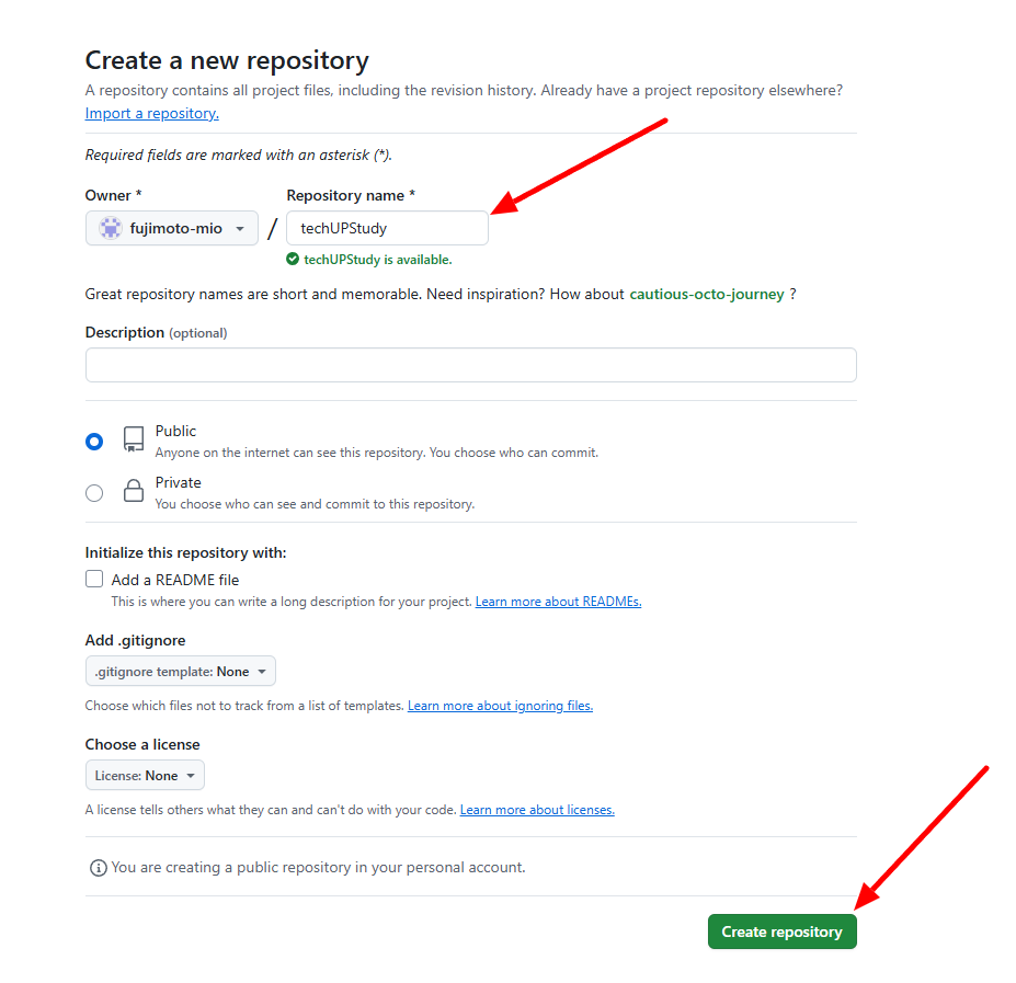 リポジトリ名は、「techUPStudy」にしてください。