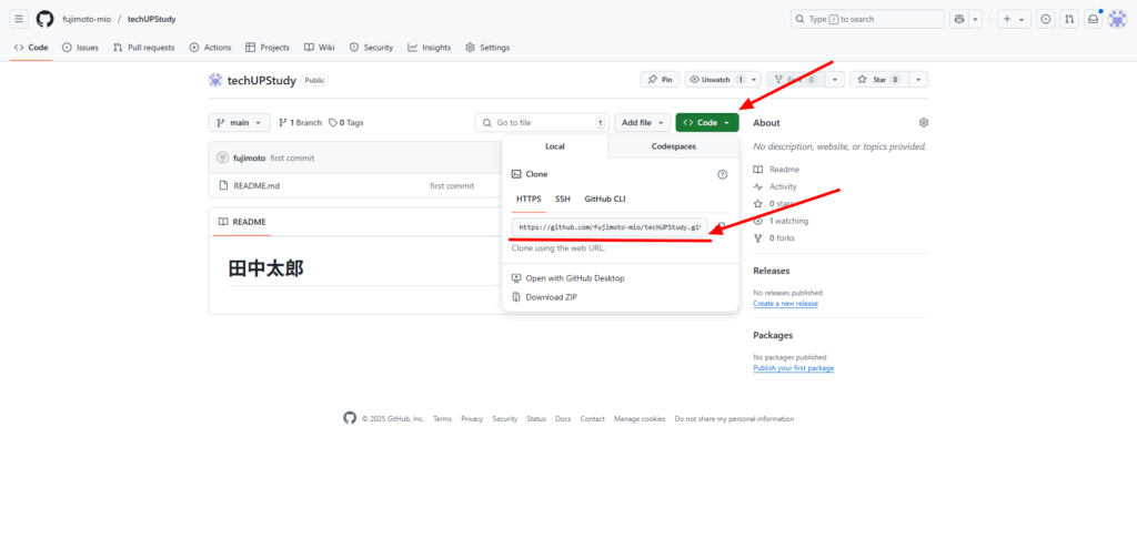 ブラウザで https://github.com/[アカウント名]/techUPStudy[リポジトリ名] を開けます。