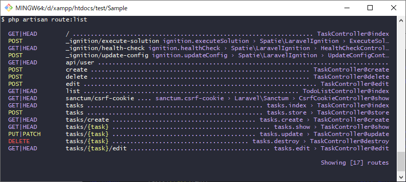 TaskController.php内の各メソッドが使用できる設定にしました。これらのメソッドを呼び出すURIがあらかじめ決めています。確認のため以下のコマンドを実行してみよう。