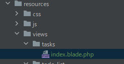 resources/viewsのフォルダ直下にファイルを作成も可能ですが、ここでは、viewsフォルダ直下に「tasks」フォルダを作成して、その中にindex.blade.phpを作成します。