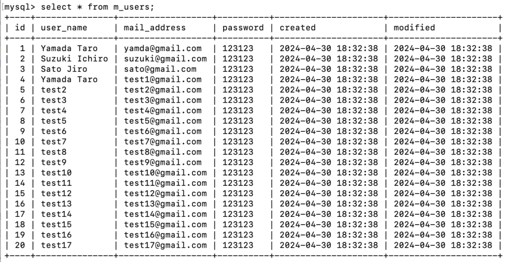 mysql> SELECT * FROM m_users WHERE id = '1'; +----+-------------+-----------------+----------+---------------------+---------------------+ | id | user_name | mail_address | password | created | modified | +----+-------------+-----------------+----------+---------------------+---------------------+ | 1 | Yamada Taro | yamda@gmail.com | 123123 | 2024-04-30 18:32:38 | 2024-04-30 18:32:38 | +----+-------------+-----------------+----------+---------------------+---------------------+ 1 row in set (0.17 sec) |