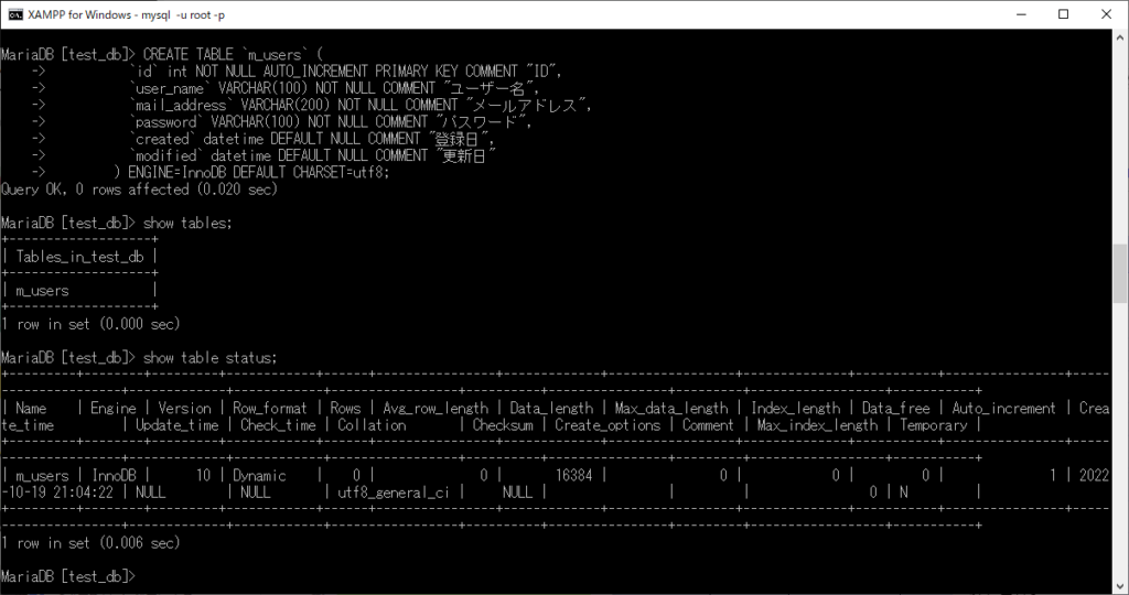// テーブル作成 MySql内で実行してください CREATE TABLE `m_users` ( `id` int NOT NULL AUTO_INCREMENT PRIMARY KEY COMMENT "ID", `user_name` VARCHAR(100) NOT NULL COMMENT "ユーザー名", `mail_address` VARCHAR(200) NOT NULL COMMENT "メールアドレス", `password` VARCHAR(100) NOT NULL COMMENT "パスワード", `created` datetime DEFAULT NULL COMMENT "登録日", `modified` datetime DEFAULT NULL COMMENT "更新日" ) ENGINE=InnoDB DEFAULT CHARSET=utf8; //一覧 show tables; // 詳細 show table status; |