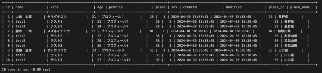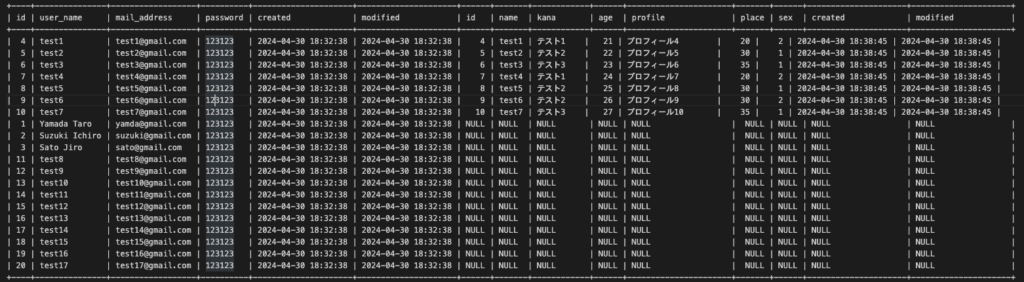 m_users:20件・ m_profiles:10件・m_place(都道府県テーブル):47件