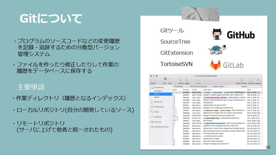 - Gitは、プログラムのソースコードの変更履歴やバージョン管理を行うためのツールです。開発者がコードを修正したり、新しいコードを追加したりすると、その履歴がGitに保存されます。これにより、過去の作業内容を追跡したり、誤って変更を加えてしまった場合に以前のバージョンに戻したりすることができます。Gitは分散型バージョン管理システムであり、開発者それぞれがローカルで作業した内容を後で統合できます。これにより、チームメンバーは個々の変更を独立して行いながらも、最終的には一つのリポジトリに統合することが可能になります。