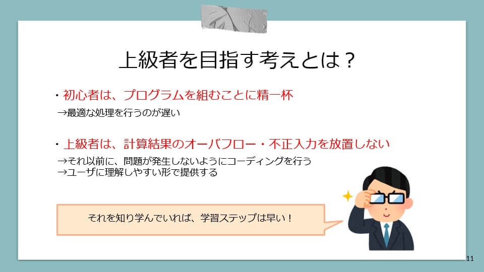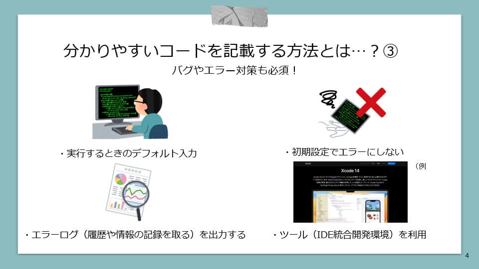 分かりやすいコードを記載するにあたって、バグやエラーへの対策も必要です。