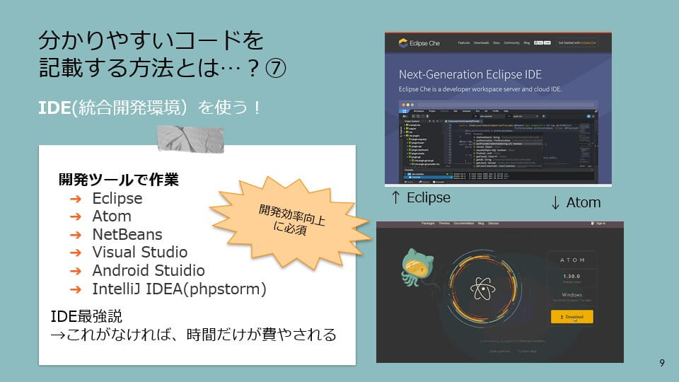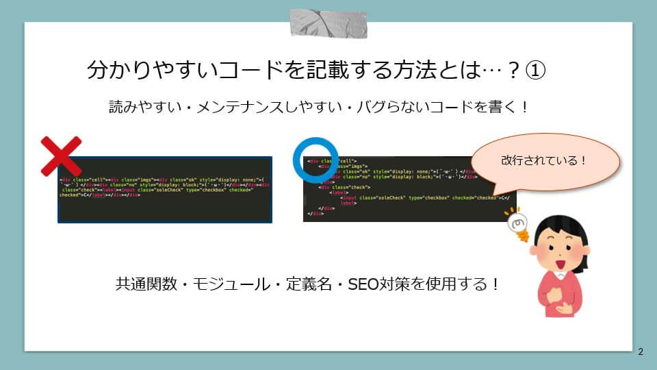 また、コーディング規約を守って、見やすいコードや分かりやすいコードを記載することも重要です。