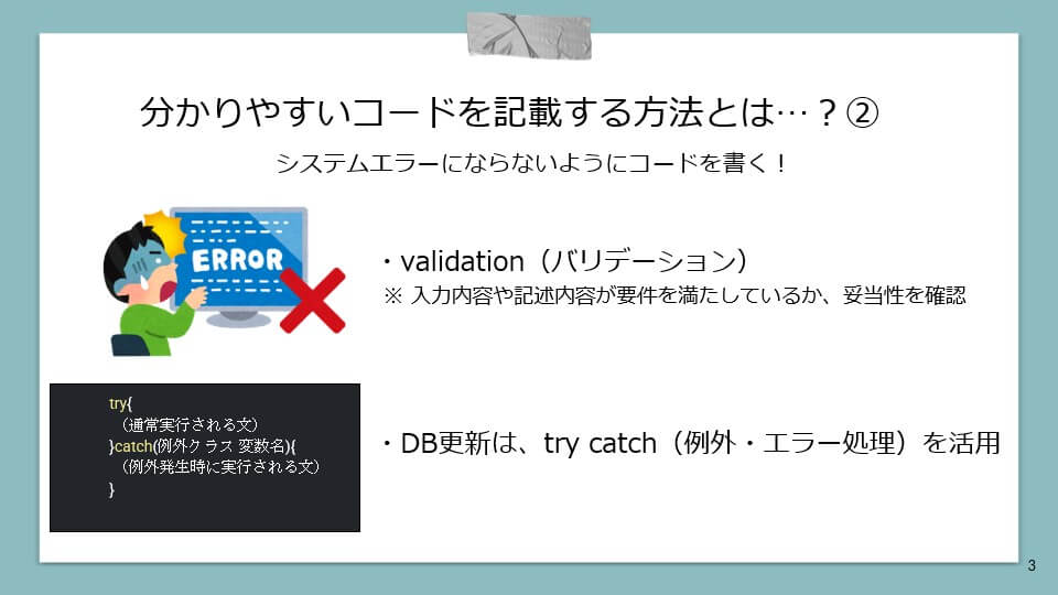 コードを書くうえで、システムエラーを起こさないことも重要です。