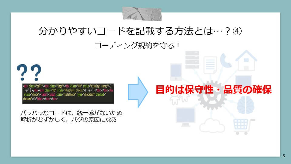 これにより、保守性や品質の向上が図れるので、しっかりと理解し守ることが重要です。