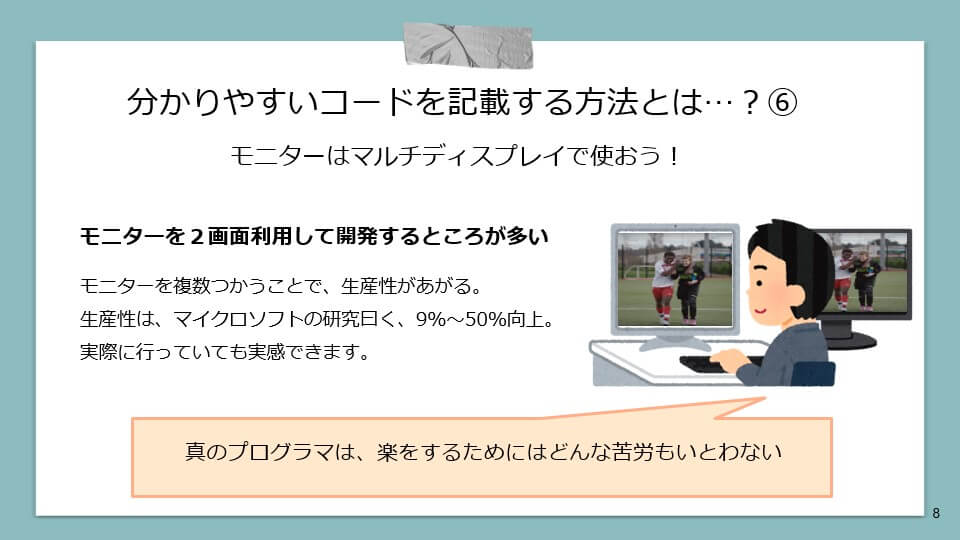 もし、自分ひとりで完結するシステムを開発するのであれば、コードの見やすさはそれほど重要でないかもしれません。