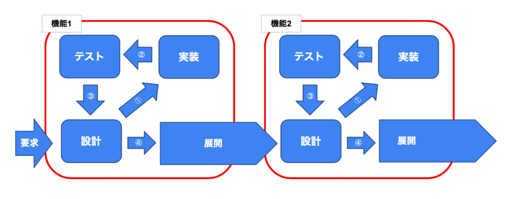 要件や仕様を最初にすべて決めるのではなく、小さな単位(機能や画面など)ごとに計画・開発・テスト・レビューを繰り返しながら進めていきます。